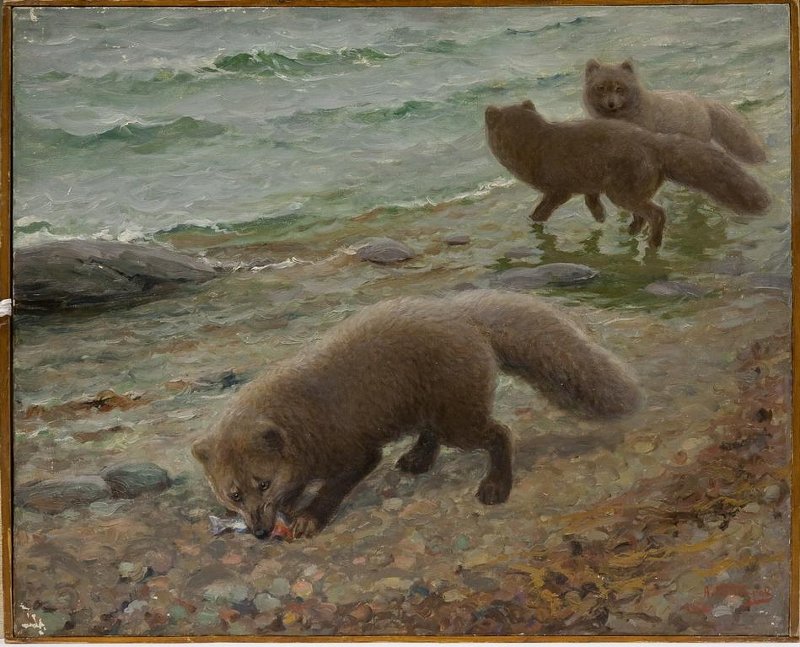 На первом плане картины горизонтального формата изображен коричневато-серый песец на каменистом морском берегу возле кромки прибоя. Песец стоит головой влево параллельно кромке прибоя, и, припав на передние лапы, ест маленькую рыбку. На втором плане справа еще два серых песца бредут справа налево вдоль берега, неглубоко зайдя в воду. Морская вода зеленовато-голубая, берег покрыт разноцветной галькой. Краски наложены пастозно, фактура мазка хорошо видна.