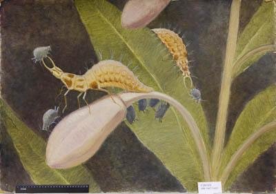 На оливково-зеленом фоне крупно изображено травянистое растение с ланцетовидными листьями и двумя бутонами на лиловато-белом стебле. На бутоне слева сидит личинка златоглазки, серповидными челюстями удерживающая тлю. Личинка телесного цвета с розовыми и коричневыми пятнами. Перед личинкой на бутоне сидит вторая тля. На стебельке бутона висят ещё 4 тли. Справа по краю листа ползёт ещё одна личинка златоглазки, её челюсти тянутся к тле.