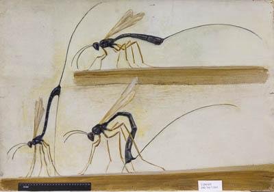 На светлом фоне три фигуры наездника из семейства Ichneumonidae. Справа вверху самка усиками ощупывает поверхность бруска, справа огромный яйцеклад. Слева – поза подготовки ввода яйцеклада после обнаружения, брюшко высоко поднято вверх, яйцеклад поставлен перпендикулярно к поверхности бруска. Справа внизу изображен момент ввода яйцеклада в обнаруженную в бруске жертву.