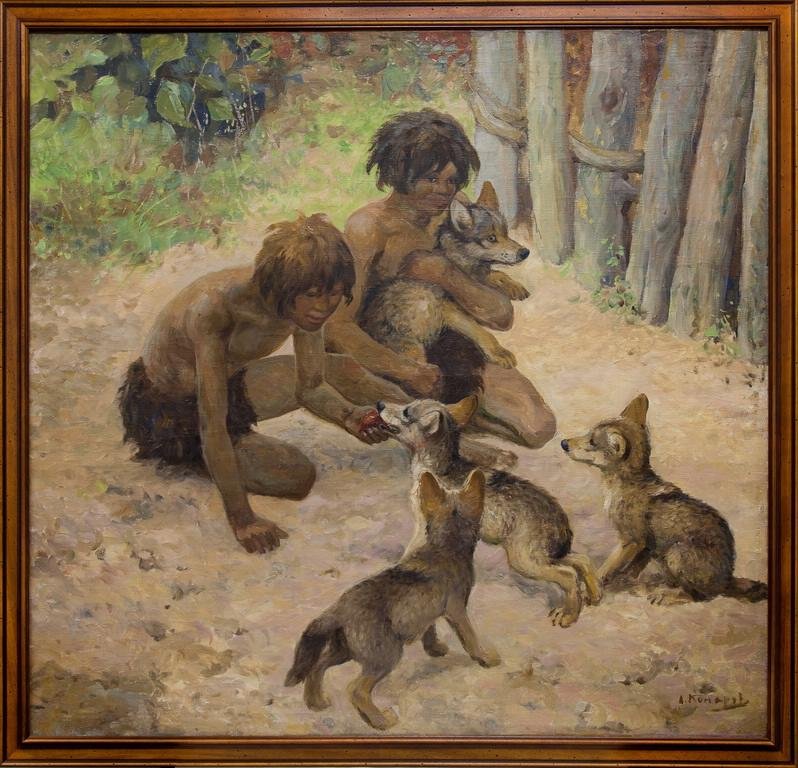 Картина горизонтального, близкого к квадрату формата. Основная колористическая гамма полотна теплая. Изображены двое смуглых первобытных детей, одетых в меховые темно-коричневые набедренные повязки, и четыре желтовато-серых волчонка. На первом плане справа находятся три волчонка: один стоит спиной к зрителю, навострив уши, и смотрит на другого волчонка, которого кормит сырым мясом один из мальчиков. Справа на земле сидит третий волчонок. Мальчики изображены рядом друг с другом лицом к зрителю: слева один из них сидит на земле, поджав под себя согнутую в колене правую ногу и вытянув левую. Его волосы несколько светлее, чем у правого. Опираясь о землю правой рукой, левой он протягивает сырое мясо стоящему перед ним, поджав хвост, волчонку. Справа на коленях сидит второй мальчик, прижимая к себе руками четвертого волчонка. Дети изображены на охристо-желтой, чуть розоватой земле. Справа возвышается деревянный забор-частокол, а слева видна ярко-зеленая трава и растения с широкими листьями. Краски наложены плотно, фактура мазка хорошо видна.