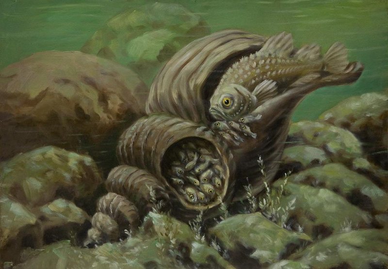 Eumicrotremus, охраняющий своих мальков в раковине трубача. Картина