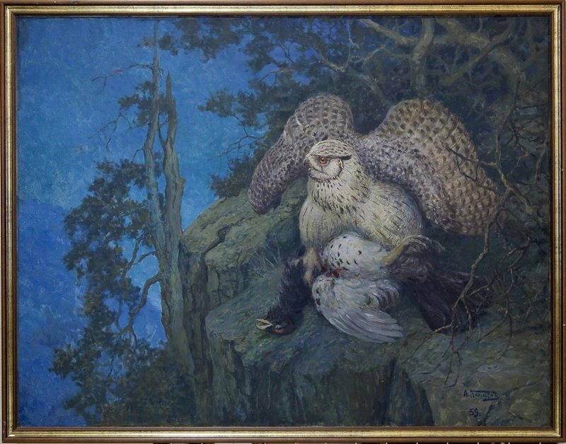 Светлый уральский филин с белобрюхим глухарем. Картина