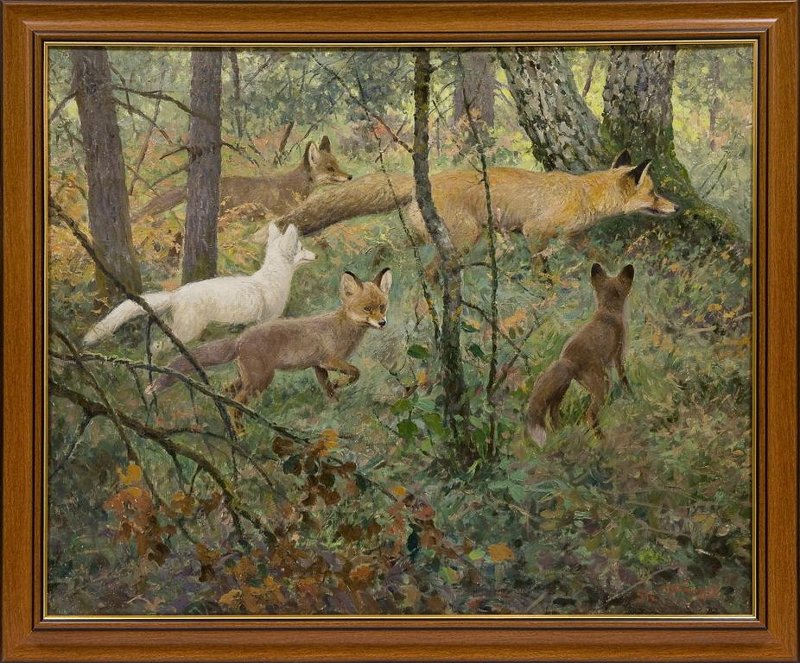 На картине горизонтального формата изображена взрослая лиса, идущая по лесу в сопровождении четырех своих лисят: три детеныша нормально окрашены, а четвертый – альбинос. Животные движутся по лесу слева направо. На первом плане слева изображены два лисенка: серовато-рыжий, нормально окрашенный лисенок повернул голову в сторону зрителя, а идущий рядом с ним белый лисенок-альбинос смотрит на свою мать. Справа на первом плане изображен со спины еще один лисенок. На втором плане справа идет взрослая рыжая лиса, за ней следует четвертый серовато-рыжий лисенок. В левом нижнем углу картины изображена поникшая древесная ветка с ржаво-коричневыми листьями. В центре композиции находится слегка изогнутый ствол молодого деревца. Стволы деревьев зеленовато-серые. Земля на первом плане написана различными оттенками светло-зеленого, серого, коричневого и охры. Дальний план – золотисто оранжевый, желто-зеленый. Краски наложены плотно, пастозно, фактура мазка хорошо видна.