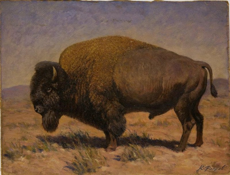 На листе горизонтального формата крупно боком головой влево изображен бизон на фоне прерии.