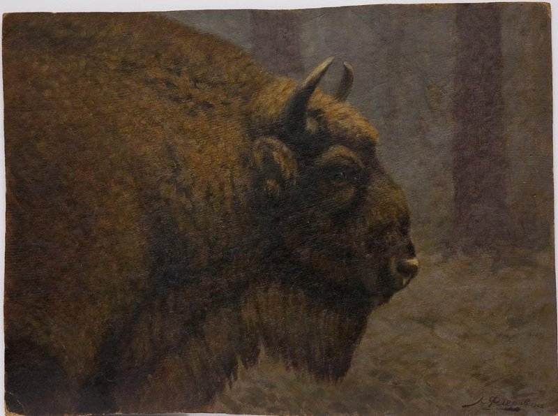 На картоне горизонтального формата крупным планом дано изображение головы зубрицы в профиль вправо на фоне обобщённо изображенного леса. Голова животного контрастирует с фоном и выделяется лишь благодаря красновато-охристому тёплому оттенку шерсти.