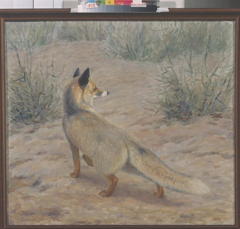 На картине горизонтального формата изображена желтовато-серая лиса - караганка. Основная колористическая гамма полотна теплая. Лиса стоит левым боком к зрителю, обернувшись назад – направо. Ее настороженные уши черного цвета, хвост она держит параллельно земле. Животное практически сливается с окружающей средой: охристо-желтой землей, покрытой редкими кустиками блекло-зеленой травы. Краски наложены тонкими лессировочными слоями.