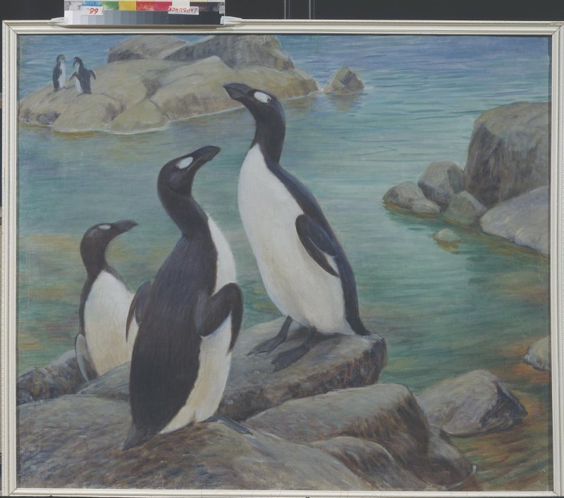 На холсте почти квадратного формата на фоне северного морского пейзажа на прибрежных скалах изображены пять бескрылых гагарок – птиц обтекаемой формы с маленькими крылышками, тёмными (сизо-черными) спинками и белым брюшком и шеей, клювы и лапы тёмные, у глаз белые пятна. На первом плане слева на камнях крупно изображены три птицы: одна в профиль влево, вторая в профиль вправо, третья фронтально с головой повёрнутой вправо. У правого края изображен скалистый выступ. На дальнем плане в море на выступающем из воды скалистом островке стоят друг напротив друга ещё две гагарки.
