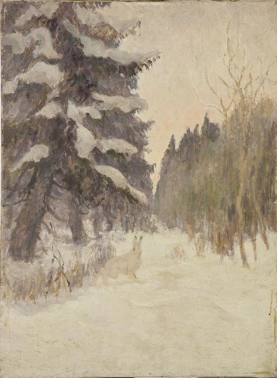 В центре картины вертикального формата изображен заяц-беляк в зимнем лесу. Животное стоит в настороженной позе, голова его повернута в сторону зрителя. Белый заяц почти незаметен на фоне чистого снега, чуть выделяются только темные кончики ушей и глаза. Заяц словно собирается пересечь просеку в лесу, обрамленную с обеих сторон деревьями. Слева стоит какое-то хвойное дерево с большими заснеженными лапами, справа поднимает свои тонкие голые ветви к небу молодое деревцо. Дальние деревья сливаются в обобщенную фиолетово-серую массу. Небо над лесом серовато-белое, чуть розовеющее к горизонту. Краски наложены плотно, пастозно, фактура мазка хорошо видна. Местами оставлен не закрашенный белый грунт.
