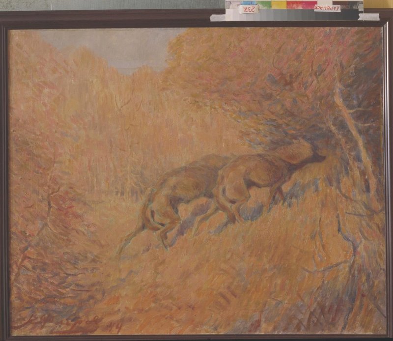 На первом плане картины горизонтального формата изображены два волка, не спеша поднимающиеся на небольшую возвышенность, поросшую кустами. Основная колористическая гамма полотна теплая. Волки, поджав хвосты, идут рядом друг с другом, но меньший по размерам на полкорпуса опережает товарища. Окраска зверей желтовато-коричневатая, гармонирующая с окружающим пейзажем. Земля покрыта золотисто-желтой травой, поляну со всех сторон окружают заросли невысоких кустов. На первом плане их кроны имеют красноватый оттенок, а в отдалении они становятся охристо-желтыми, чуть оранжевыми. Кусочек неба над ними голубовато-серый. Краски наложены раздельными мазками, между которыми местами просвечивает не закрашенный белый грунт.