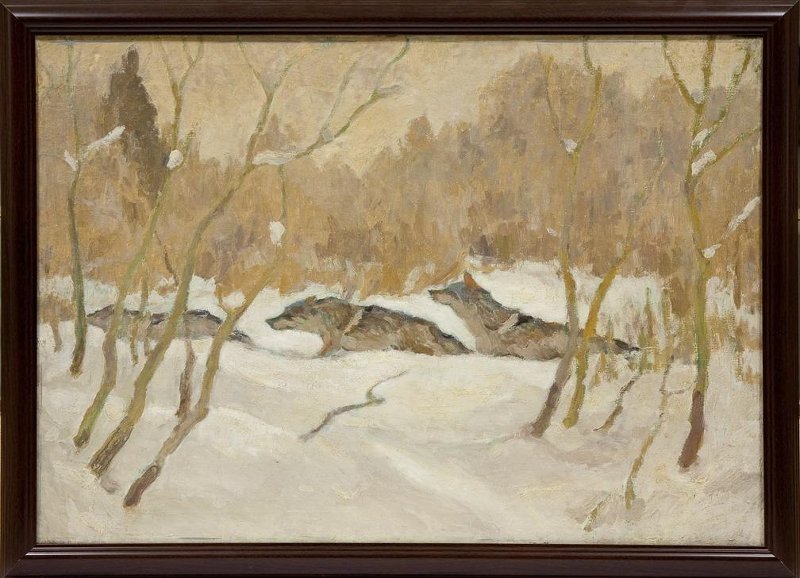 На картине горизонтального формата изображены три волка в зимнем лесу. Основная колористическая гамма полотна теплая. Волки следуют друг за другом справа налево, утопая по брюхо в глубоком снегу. На первом плане сцену фланкируют тонкие стволы деревьев, припорошенные снегом. На втором плане поляна замыкается невысокими кустами или деревьями, сливающимися в сплошную охристо-желтую, чуть коричневатую массу. Небо над лесом желтовато-белое. Животные и окружающий пейзаж написаны обобщенно, без детализации. Краски наложены плотно, пастозно, фактура мазка хорошо видна.