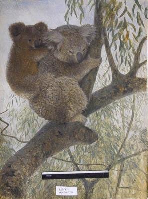 На листе горизонтального формата на ветке эвкалипта изображена коала с детёнышем, оба в профиль, головки повёрнуты в фас. Шерсть зверей коричневато-серая, чуть рыжая, с пепельным оттенком. Сквозь оливково-шалфейную зелень виднеется серо-голубое небо.