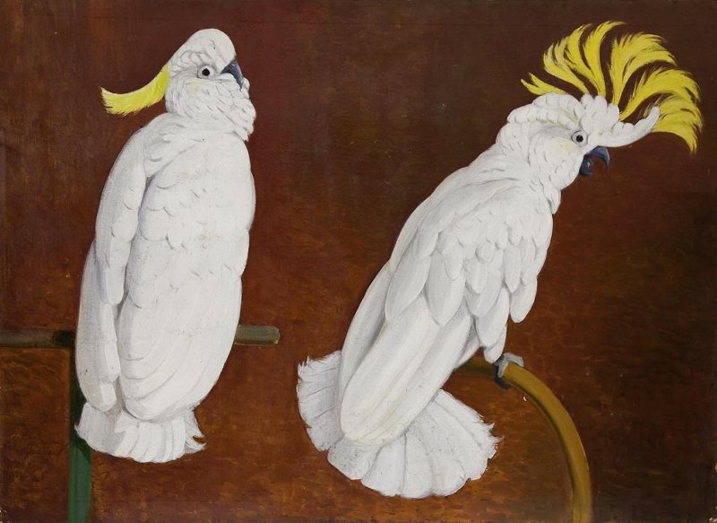 2 изображения на одном листе. На листе горизонтального формата, на тёмно-охристом фоне изображены два жёлтохохлых попугая: один сидит на горизонтальной жердочке, он изображен со спины, голова повёрнута в профиль вправо, клюв закрыт, хохолок опущен; второй - на дугообразной жердочке в профиль вправо с открытым клювом и поднятым хохолком.
