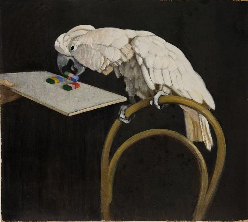 На листе почти квадратного формата, на тёплом черно-коричневом фоне изображен в профиль влево белый попугай с серым клювом. Он сидит на спинке венского стула, тянется к серой дощечке с тремя прямоугольными разноцветными брусками (каждый выкрашен в три разных цвета), взял в клюв зелёно-розово-голубой брусок. В левой части листа видна часть кисти руки, держащей дощечку.