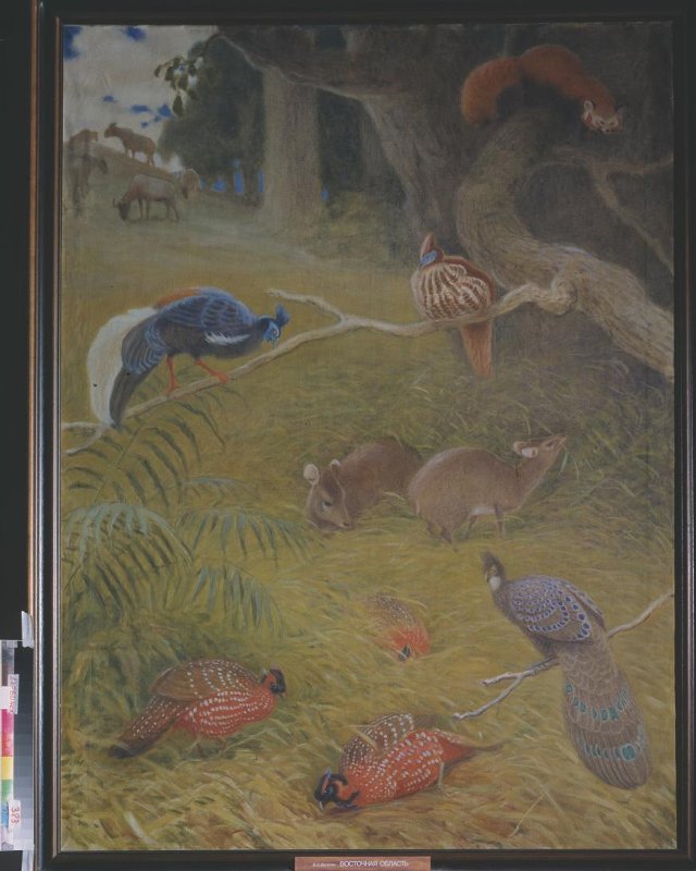 Иллюстрация фауны Бирманско-Китайской подобласти. На картине вертикального формата на фоне пейзажа с опушкой леса с толстыми стволами изображены: в центре композиции два маленьких оленя с короткими ножками, с простыми рогами и развитыми клыками; вдали пять антилоп-такинов; на дереве сидит каштаново-рыжая малая панда. Из птиц представлен серо-голубой с бирюзовами «глазками» на хвосте павлиний фазан в правом нижнем углу, слева – петухопёрые фазаны, в нижней части в центре – три ярко-красных с белыми пятнами трагопана. Яркая окраска животных особенно заметна на фоне серых стволов деревьев.