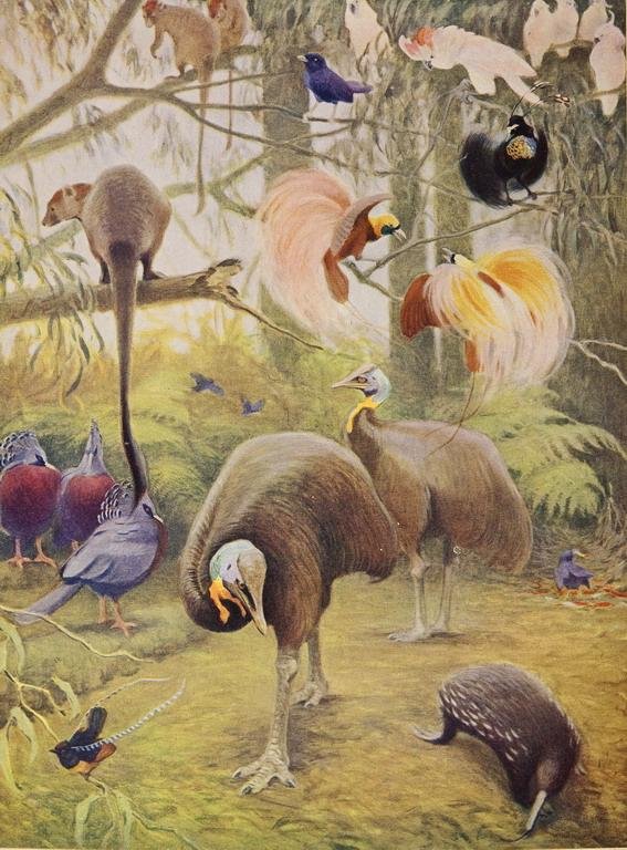 Иллюстрация фауны Папуасской подобласти. На картине вертикального формата на фоне прямых стройных светлых стволов деревьев справа, густых веток справа и охристой почвы и оливковой зелени изображены многочисленные животные. На первом плане в центре крупно изображены два казуара, справа темно-коричневая с белыми мазками ехидна, слева группа из трёх венценосных голубей, внизу слева темная райская птица с двумя длинными черно-белыми перьями. Над казуарами изображены одна напротив другой две райские птицы с коричневым телом и розово-желтыми крыльями, выше черная райская птица, левее синяя беседковая птица. В верхнем правом углу группа розовых какаду. Справа вверху на ветках изображены три серые с рыжими головками и с длинными хвостами древесные кенгуру. На дальнем плане видны ещё три беседковые птицы.