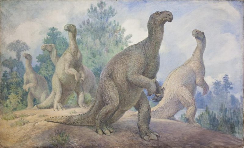 Картина горизонтального формата, основная колористическая гамма холодная. Пять игуанодонов шествуют друг за другом слева направо на фоне условно написанного пейзажа. На переднем плане изображен в профиль шагающий игуанодон. Его голова отдаленно напоминает верблюжью, глаза с вертикальными зрачками. На задних лапах у игуанодона по три пальца, в то время как на передних – по пять. Шкура животного светло-серая, с легким зеленоватым оттенком. Складки и чешуя на ней обозначены мазками темно-коричневого и синего цвета. Игуанодон, изображенный на первом плане, несколько темнее, чем находящиеся на втором плане животные потому, что он находится в тени, а они освещены солнцем. На втором плане справа изображен оглядывающийся назад игуанодон. За ним в отдалении виден водоем, окруженный деревьями. В левой части картины расположены еще три игуанодона в различных позах. Фон образуют обобщенно написанные голубовато-зеленые купы каких-то растений. Линия горизонта расположена низко. Небо – светло-голубое, покрытое легкими белыми облаками. Почва под ногами животных написана светлой охрой, на переднем плане она резко темнеет, приобретая фиолетово-серый оттенок.