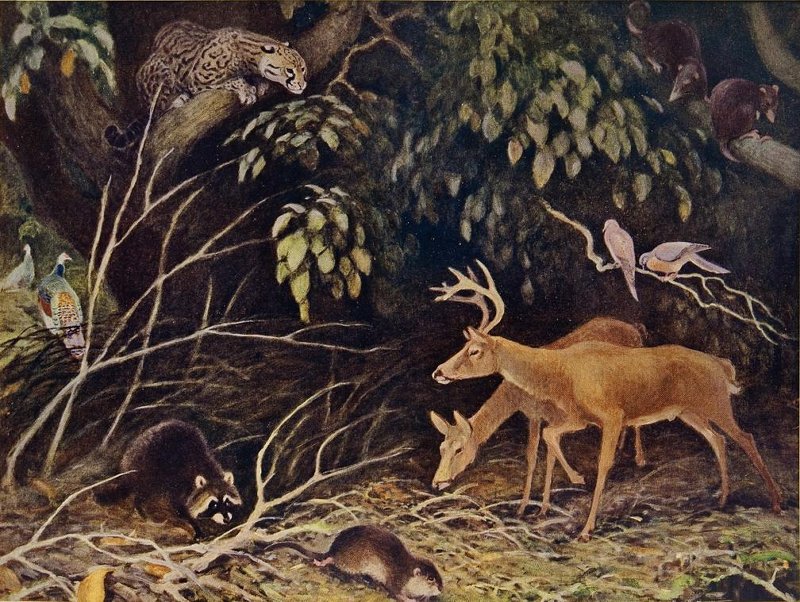 Иллюстрация фауны прерий Восточной подобласти. На картине горизонтального формата изображен тёмный лесной пейзаж с искривлёнными стволами деревьев и густой листвой. На первом плане слева на фоне серых веток и охристой упавшей листвы изображены енот и мускусная крыса, правее два стоящих в профиль влево виргинских оленя, над ними на ветке пара странствующих голубей. В левом верхнем углу картины на ветке сидит пятнистый оцелот, ниже слева на светлом фоне изображены две яркие восточные индейки. В правом верхнем углу два коричневых опоссума, центральную часть верхней части картины занимает ветка с густой листвой, утопающей в тени, но часть листьев освещена солнцем.