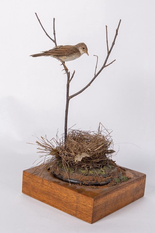 Чучело. Серая славка у гнезда. Sylvia communis Latham,1787. Классификация: Хордовые Chordata, Позвоночные Vertebrata, Птицы Aves, Воробьинообразные Passeriformes, Славковые Sylviidae, Серая славка Sylvia communis Latham,1787