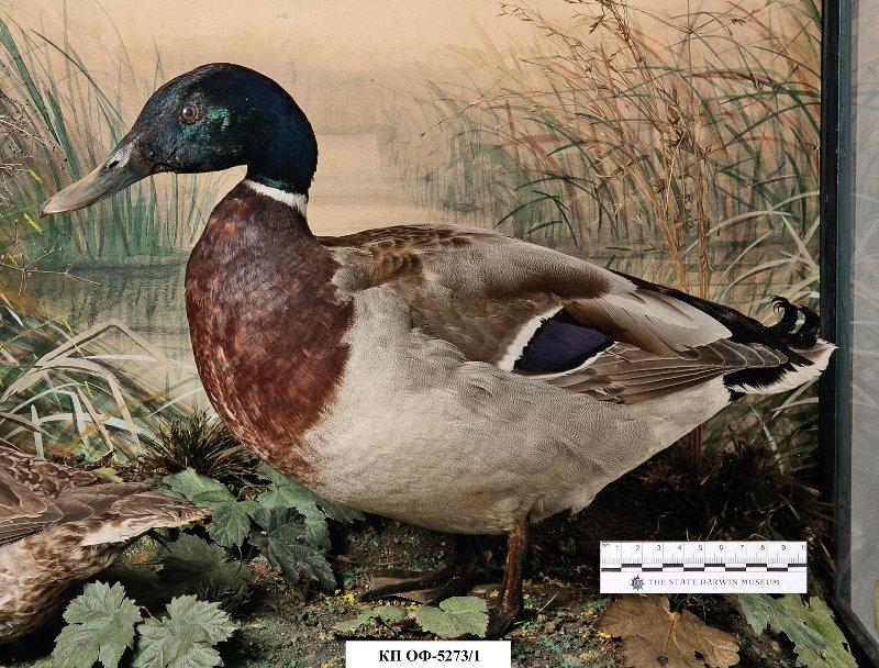 Чучело в биогруппе. Кряква. Anas platyrhynchos L.,1758. Классификация: Хордовые Chordata, Позвоночные Vertebrata, Птицы Aves, Гусеобразные Anseriformes, Утиные Anatidae, Кряква Anas platyrhynchos L.,1758