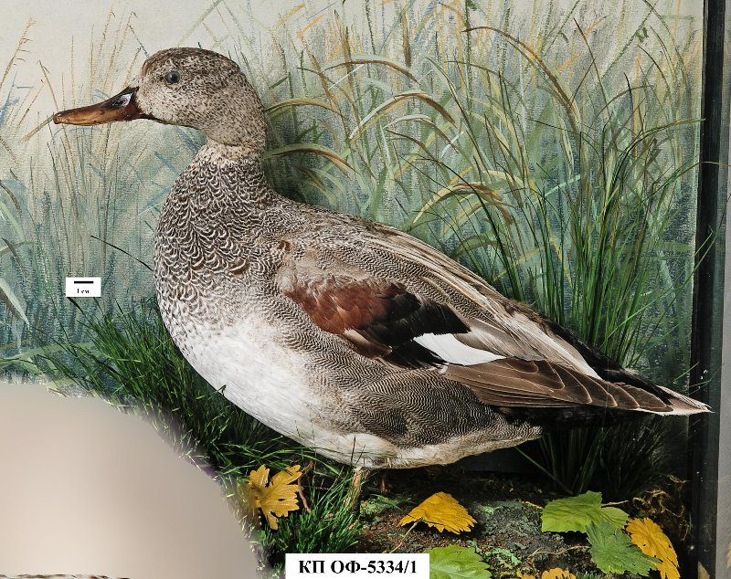 Чучело в биогруппе. Серая утка. Anas strepera L.,1758. Классификация: Хордовые Chordata, Позвоночные Vertebrata, Птицы Aves, Гусеобразные Anseriformes, Утиные Anatidae, Серая утка Mareca strepera (L.,1758)