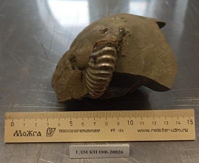 Внешнее ядро раковины. Фрагмент конкреции (сидерит-кальцит) с перламутровой раковиной аммонита-десайезита
