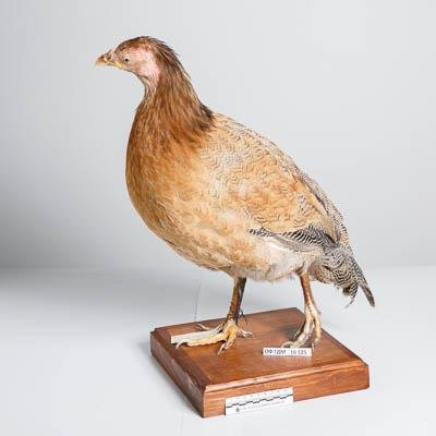 Чучело. Гибрид загорской белогрудой цесарки и петуха породы Орпингтон. Классификация: Хордовые Chordata, Позвоночные Vertebrata, Птицы Aves, Курообразные Galliformes
