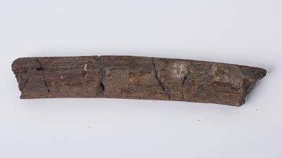 Фрагмент ребра ихтиозавра. Пористый. Хрупкий. Чёрного цвета. Частично реставрирован. Склеен из нескольких кусков.
