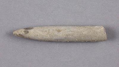 Ростр белемнита. Ростр циллиндрической формы, поперечное сечение вблизи устья - вертикально-эллиптическое, альвеола закрыта пробкой из вмещающей породы. Поверхность ростра корродирована. Фрагмакон - отсутствует. Окраска образца - серая.