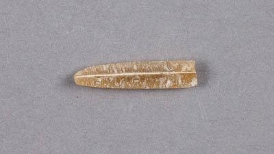 Фрагмент ростра небольшого белемнита. Ростр веретёновидной формы. Терминальный хвостовой шипик и фрагмакон не сохранились.