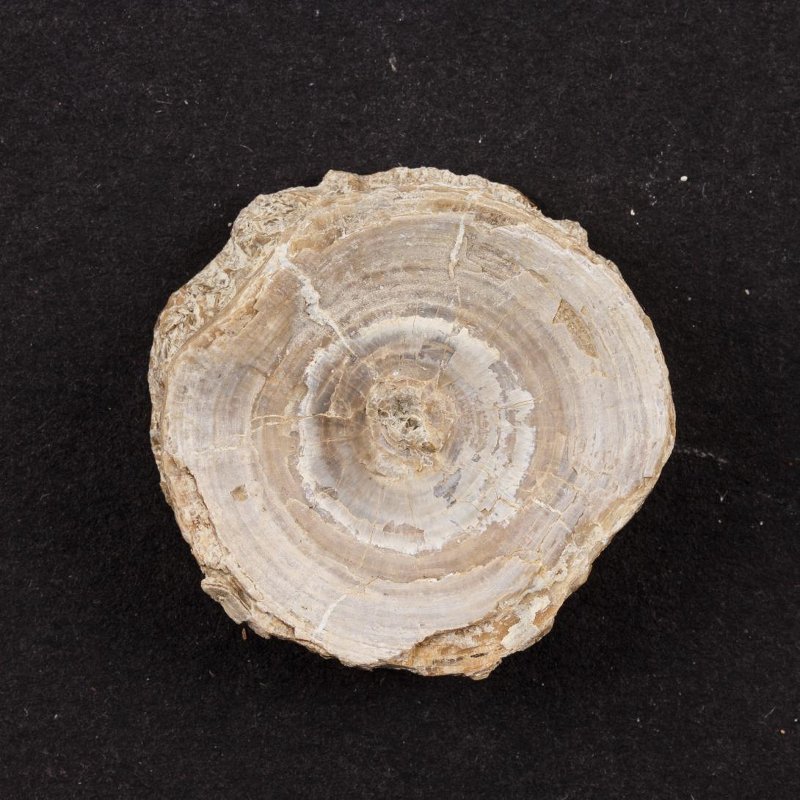 Деформированный позвонок акулы. Шайбовидный. Двояковогнутый. Вогнутая поверхность несёт рисунок из тонких концентрических струек наракстания. Трещиноватый. Хрупкий. Общая окраска образца - бежевая.