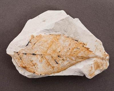 Отпечаток коричневого цвета почти полного листа на грязно=белом алевролите