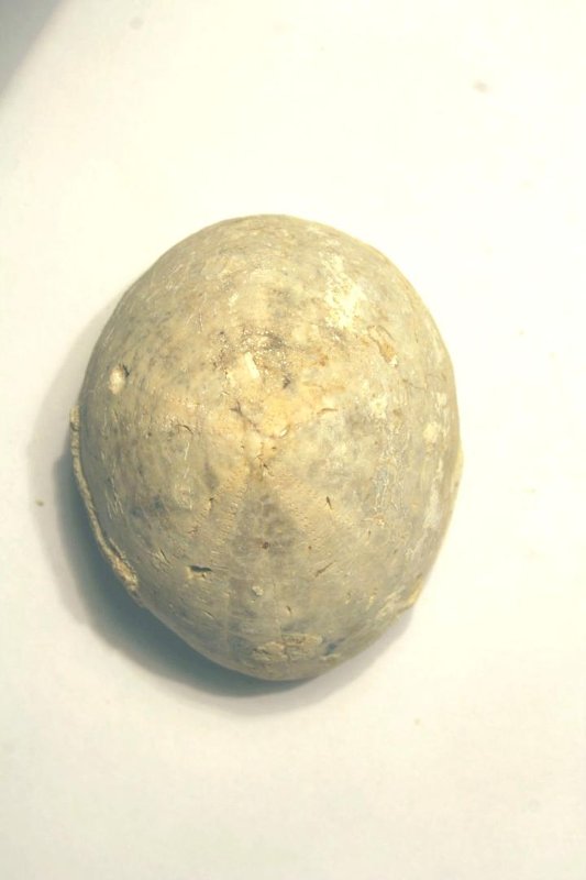 Округлый панцирь морского ежа с четко выраженными амбулакральными и интерамбулакральными полями. Цвет бежевый.