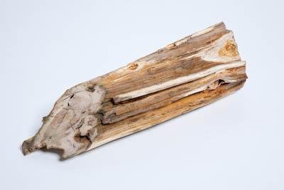 Обломок ископаемой древесины со следами деятельности корабельных червей. Общая окраска - в жёлто-оранжево-коричневых тонах.