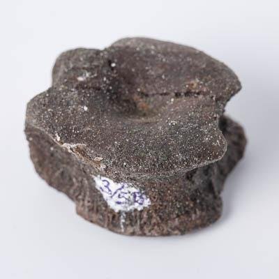 Позвонок ихтиозавра пористый, хрупкий. С одного из торцов рассечён крупной трещиной. Тёмно-серого цвета. Дуги позвонка - не сохранились.