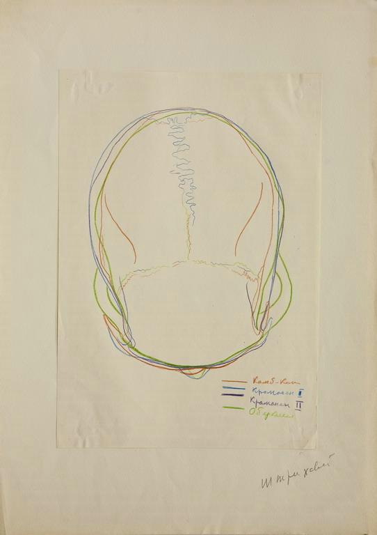 Сравнительная схема формы свода черепов верхнепалеолетических людей. (20а). (Комб-Капелль, Кро-Маньон I, Кро-Маньон II, Оберкассель). Вид сверху. Рисунок